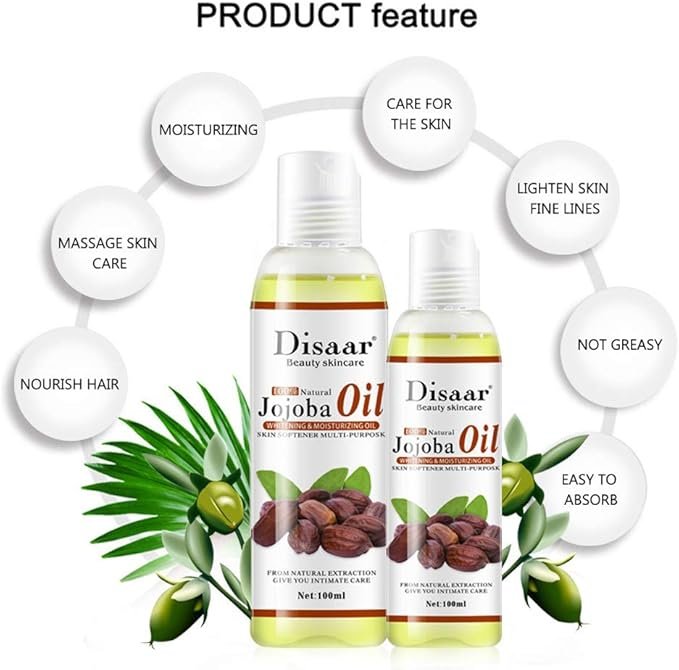 DISAAR Pure Natural Jojoba Oil is a premium multi-purpose oil designed to hydrate, balance, and restore both skin and hair. Rich in vitamins and nutrients, it closely mimics the skin’s natural oils, making it highly effective for moisturizing without clogging pores.